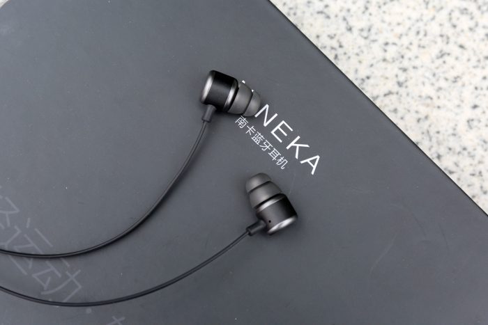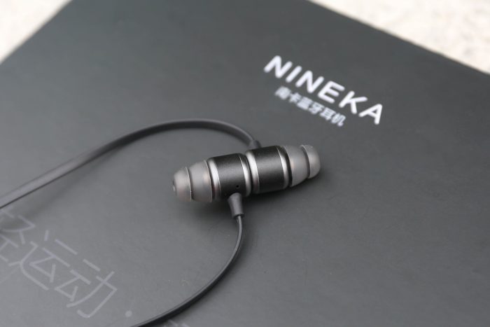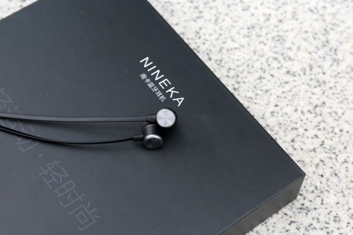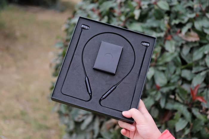 打开盒盖,就能看到这款产品了,因为南卡S1的无线蓝牙耳机,采用了脖挂的佩戴设计!所以从包装上看显得稍微大了点,中间还有一个装配件的小黑盒!