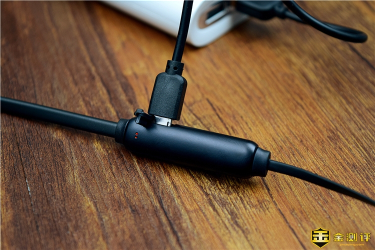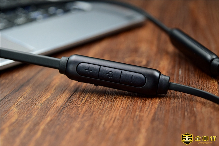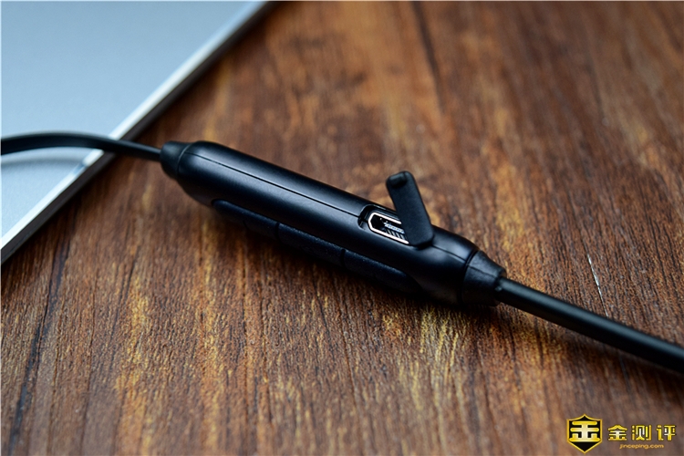 耳机的线控部分在右侧,有音量+键、电源键和音量-键,按键表面加入了软胶材质,按上去手感舒适,其中电源键可以进行开关机、播放暂停、接听/挂断等操作, 长按音量键可以进行歌曲切换。在线控区域的侧面是充电口,还加入了橡胶防尘塞,不充电的时候可以盖住,能够起到防尘防水的作用。