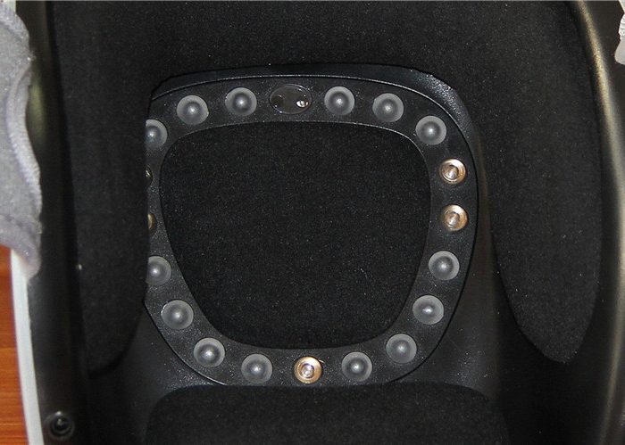 护膝宝有三种工作模式:全域(激光+红外+揉捏+加热),保养(激光+揉捏+加热),放松(红外+揉捏+加热),点触模式键即可在各功能间依次循环,从后侧可以看到内部红外光照射器和软激光模开启后发出的红光。