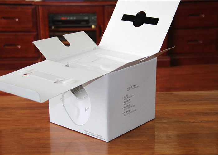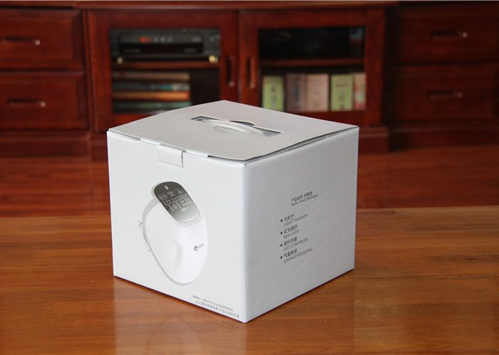 宾多康护膝按摩仪(简称护膝宝)采用了灰白基调的浅色纸质外包装盒,配以简单的文字和图案,感觉十分清爽。