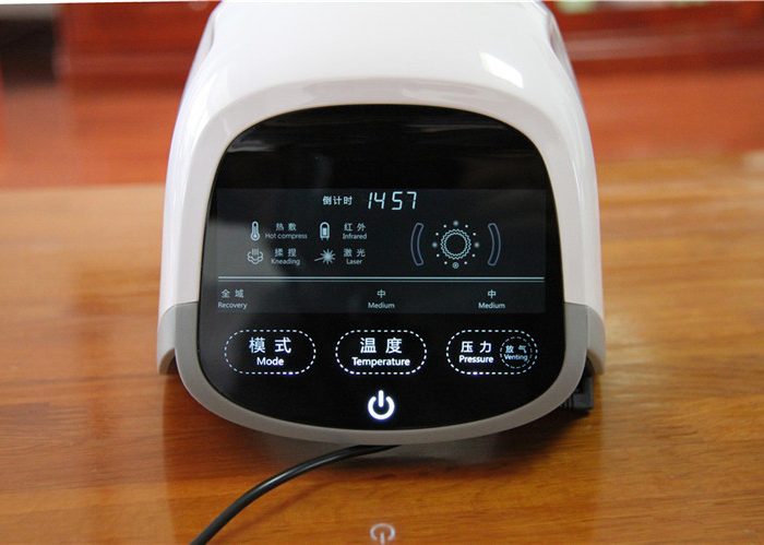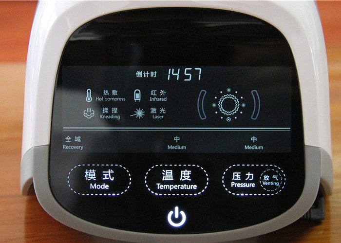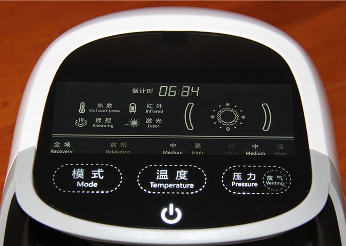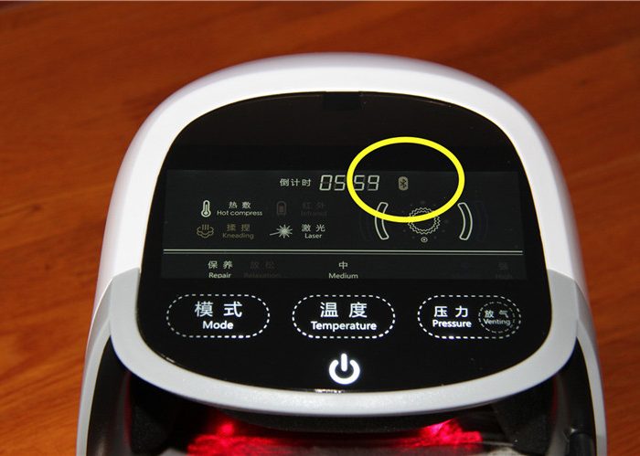 屏幕顶部是倒计时显示,上部左侧显示工作状态和参数,包括激光、红外、按摩开启状态,温度和压力等级,以及工作倒计时等参数的文字显示,采用了中英文对照,上部右侧则是用模拟图形闪烁来形象展示各功能的开启状态。如果也参考按键的字号将上部字体再加大一些就更方便眼神不好的老人们辨识了。