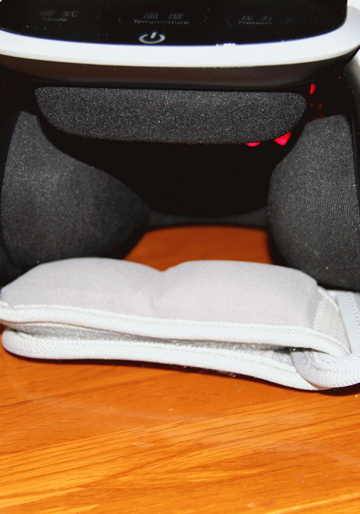 使用时将膝部呈90度左右弯曲,将按摩仪套在膝关节上,系紧绑带,力度以自己无不舒服的感觉为好。建议直接让按摩仪接触皮肤,理疗效果应该最好。连接电源后,屏幕的电源键的蓝色指示灯亮起。气囊内部应该是填充了海绵,再加上表面的绒布,佩戴后触感柔软舒适。