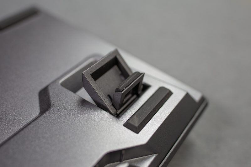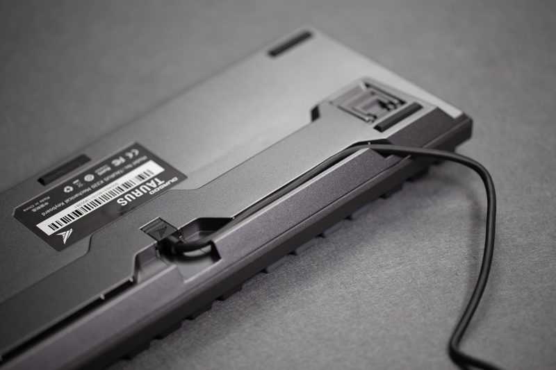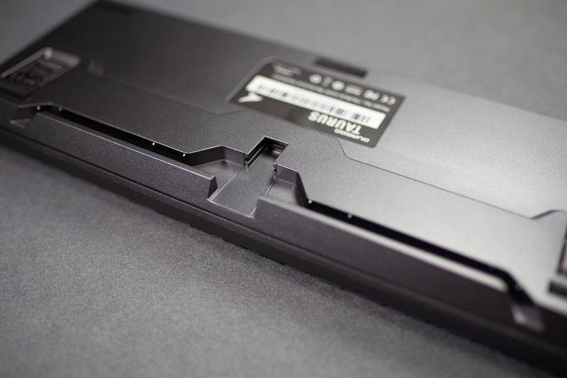 键盘的底盘部分第一个吸引到我的就是下图里的导线槽,从后方、左方右方都可以出线,可以让线缆摆放的方向更加自由,也有利于桌面线材的打理。