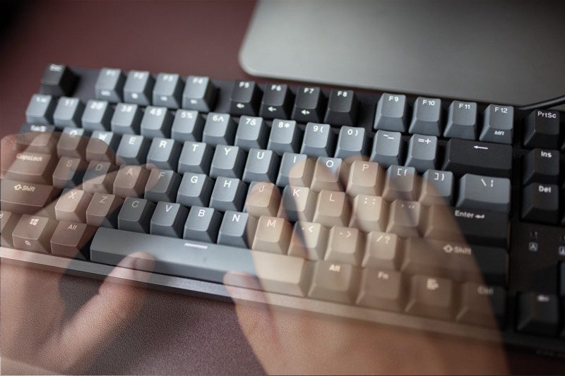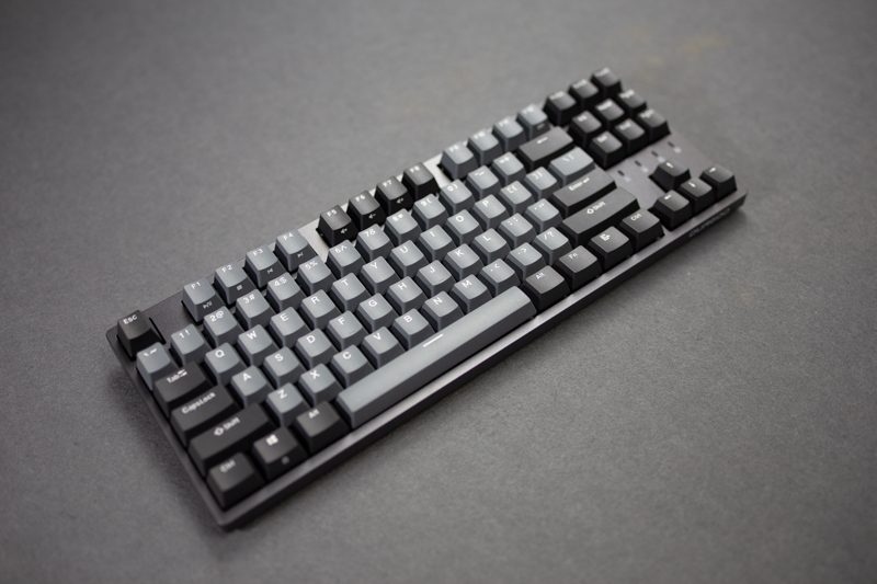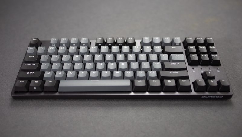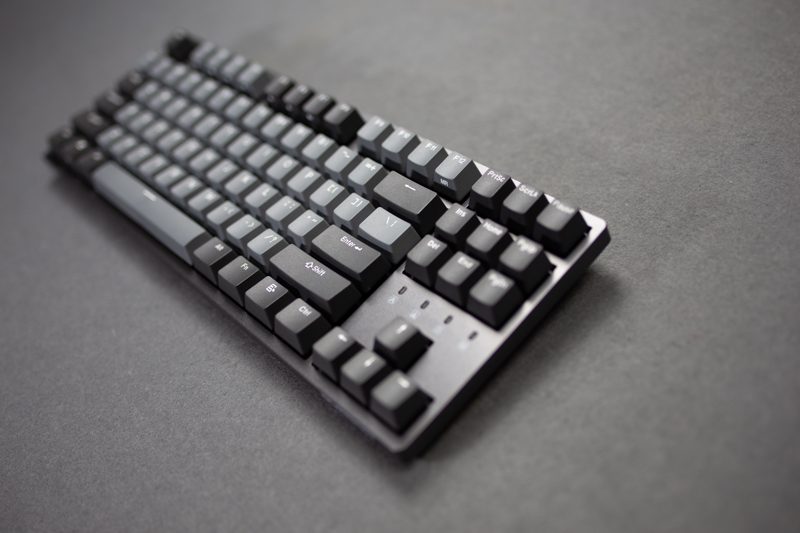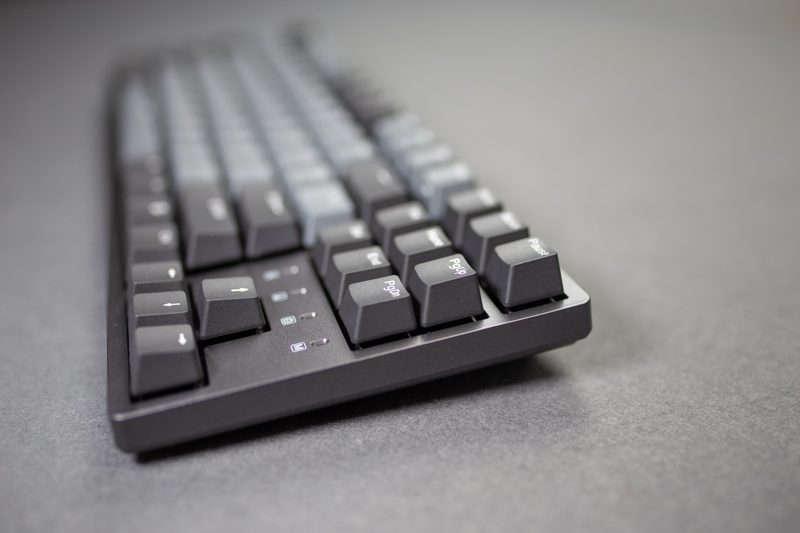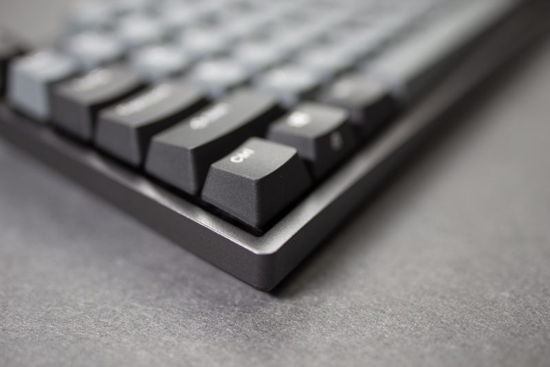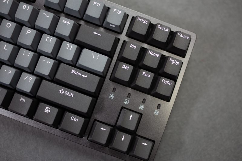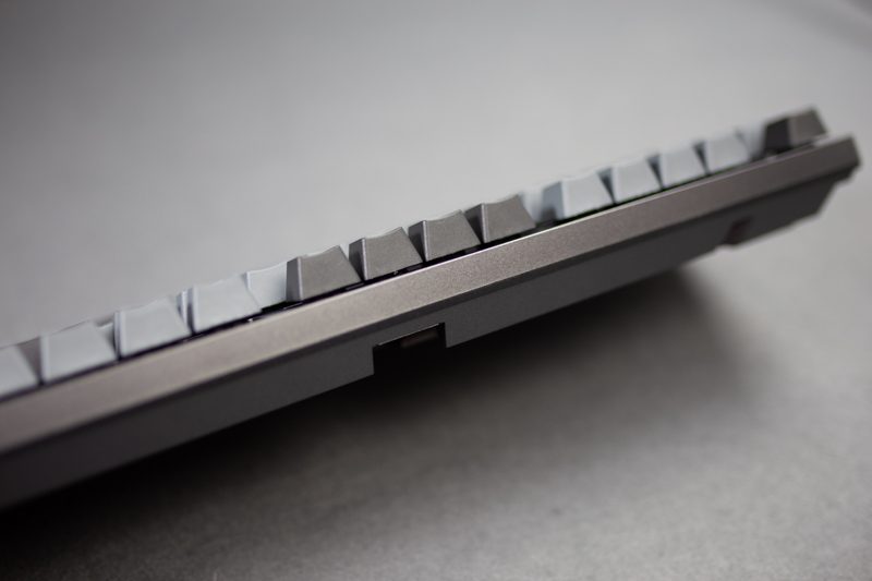 从侧面看它的边框控制还是比较宅的,加上87规格的设定,整个键盘看起来有明显的精巧感,上面板并没有采用凹陷设计,所以从本质想来讲还是属于悬浮式键帽的构架。