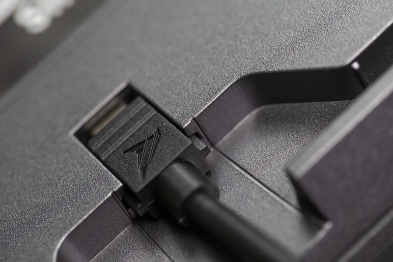 线缆接入键盘的部位有个精妙的卡扣设计,这个设计似乎是比较少见到的。好处是能让接口更加稳固,搬动键盘的时候可以防止线缆拔出,好评!