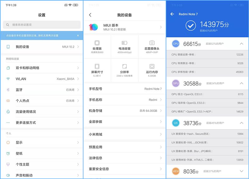Redmi note7 开箱时运行的是MIUI10.2.5系统,它基于安卓Android P深度定制。小爱可以在主菜单唤醒。它的 处理器采用的是满血版的骁龙660 AIE 八核,最高主频为 2.2GHz ,Adreno 512 的图形处理器,最高主频 650 MHz。用安兔兔跑了一下分,它的最高分为143975分。性能还是挺可以的。