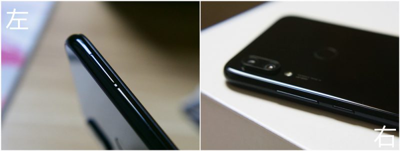 手机的左边是SIM卡槽,右边是电源键和音量键。Redmi note7 的外观采用的是前后玻璃设计,中框为塑料材质。