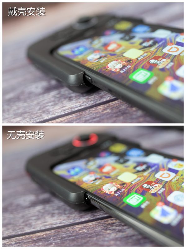 大家注意看下图:手柄下方其实已经把iPhone XS MAX的音量键遮挡掉一部分了,但是并不会造成误操作到音量键的底部,因为仔细看下图可以发现凹槽宽度较大,所以手机放入时并没有触碰到音量键。另外值得一提的是无论iPhone XS MAX戴套还是不戴套插入,都能完美契合哦!