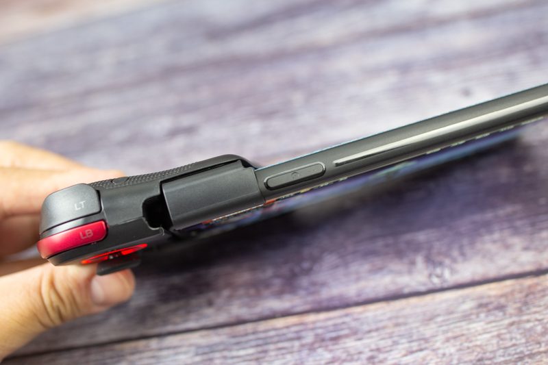 手柄开启电源的方式很巧妙,只要提上拉杆,电源就自动开启了,收回拉杆的话电源会自动关闭掉。如果此时放入手机的话,电源是持续通电的。这个小设计很是让我喜爱,这样不仅让手柄少了一颗电源键,对于用户使用来说也显得更加方便快捷了。