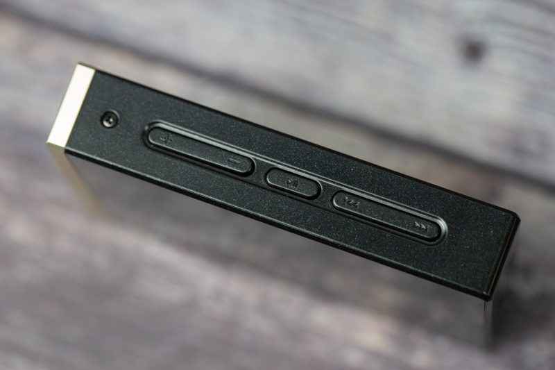 主机右侧搭载了3个常规按键,可以看出为了防止误触已经尽量把它做得跟外壳相平行。在系统里可能锁定按键,一旦开启锁定,黑屏状态下就无法操控播放器了。锁定键设计在系统里感觉操作起来还是颇有不便,如果能想办法整合进电源键里或许会更舒服一些。