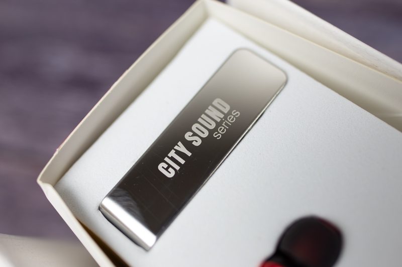言归正传说耳机吧。声武士C3的包装偏简约,设计思路偏低调。打开包装就能看见下图里的线夹,全金属来的,显然是个有心的设计点。