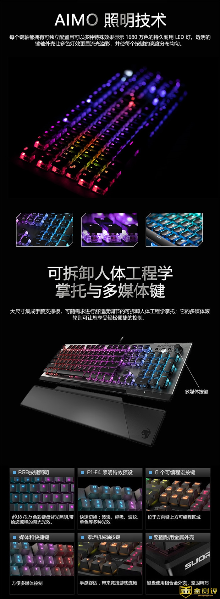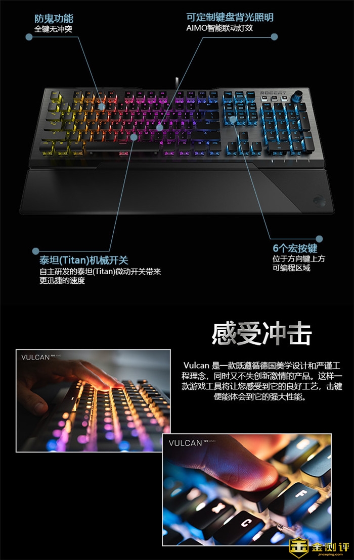 金测评希望你客观、专业、场景化的真实体验分享,而且众测报告必须是100%原创,抄袭将永久拉入黑名单。 本次为大家带来“德国冰豹(ROCCAT)瓦肯Vulcan120机械式电竞游戏键盘” 的试用,一起来看看吧。