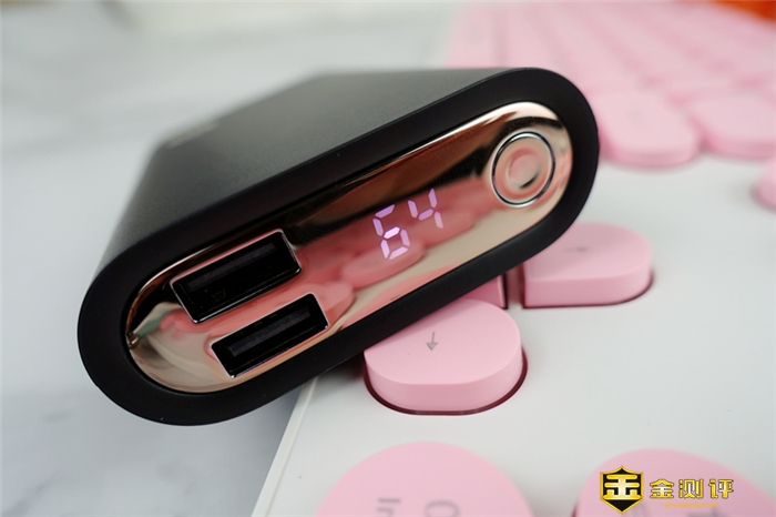 顶部的香槟金色和其外壳的磨砂黑融为一体,非常的漂亮,左边设计了两个USB快充输出口,中间位置是智能数显区域,会显示当前的电量,右边则是智能按钮。