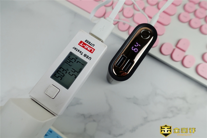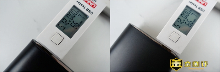 移动电源的安全性不仅在于充电时的安全,也在于平时放置时是否会爆炸,是否会出现漏电等现象,下面笔者通过USB电流电压检测器,分别对两个USB快充输出口在空载状态下进行测试,可以看到两个USB口的电压都为5.12V,电流也都为0.00A,这说明这款移动电源在没有使用的时候,是没有任何电流输出的,非常的安全。