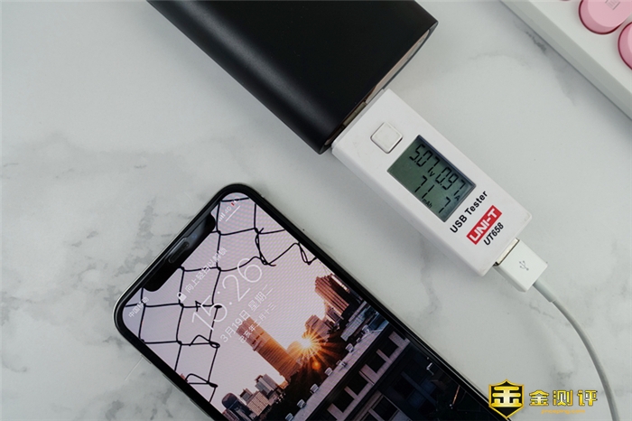 对于移动电源给手机进行有线充电时的表现又如何呢,通过USB电流电压检测器可以看到,充电速度还是比较快的,毕竟采用的是快充的充电口,其电压为5.07A,电流为0.97A,充电速度还是非常快的,也非常的稳定,同时内置了多重电路保护功能,能够智能保护充电设备不受损坏,以笔者的iPhone X手机来例,电池的容量为2700mAh,那么充满一部手机大概也就1个小时左右,而图拉斯无线充移动电源有10000mAh的大容量,那么可以连续充3次左右。