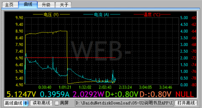 使用上机位软件进行全程的数据测试,可以看到,在前1个小时内,充电电压一直处于9V左右,充电电流逐步下降。