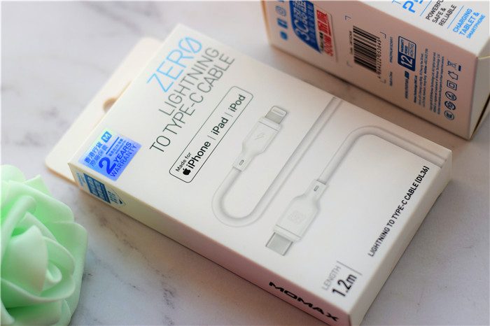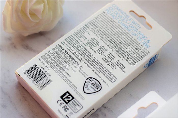 除了入手了小白C to Lightning快充线之外,我还入手了MOMAX18W快充插头,同样采用纸质包装,包装上面有产品的实拍效果图等详细信息。