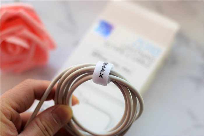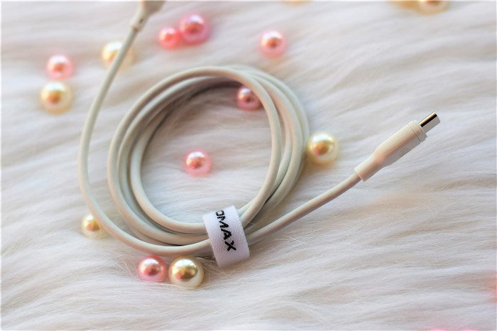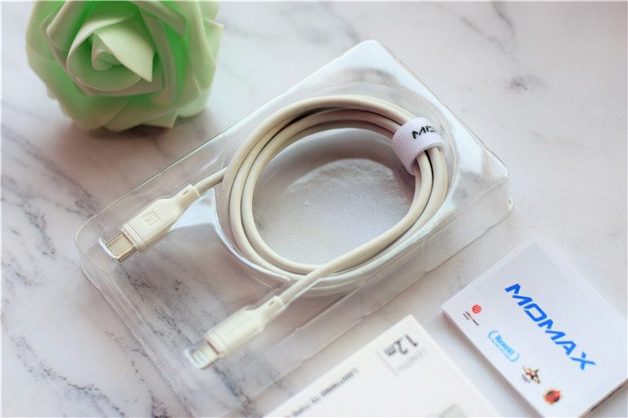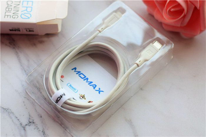 随线附赠了收纳绳,方便我们收纳快充线。收纳绳上面印有“MOMAX”的品牌LOGO。线材的整体粗细也比较粗。