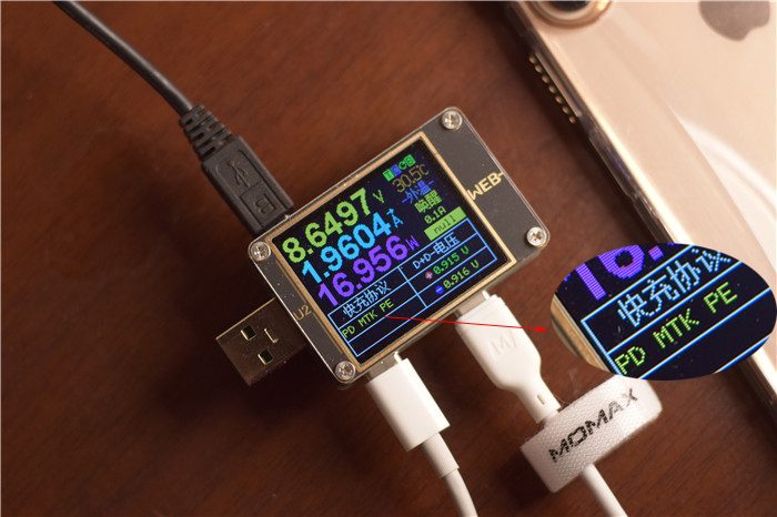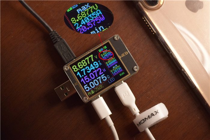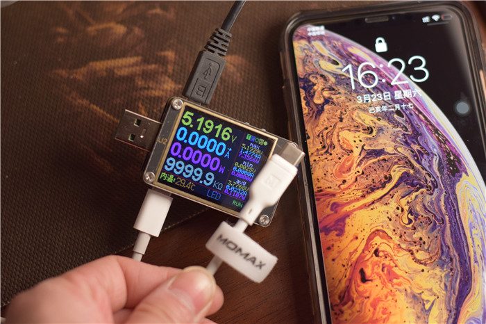 对于iPhone XS Max快充线的实际效果如何,我们直接使用工具进行测试吧!使用苹果官方384的30W快充插头,连接小白C to Lightning快充线,使用工具实时测试电压、电流、功率的情况。