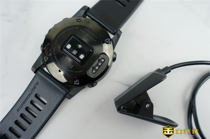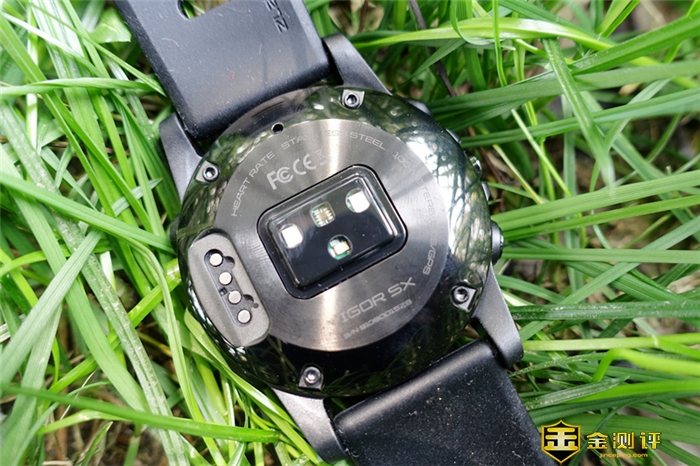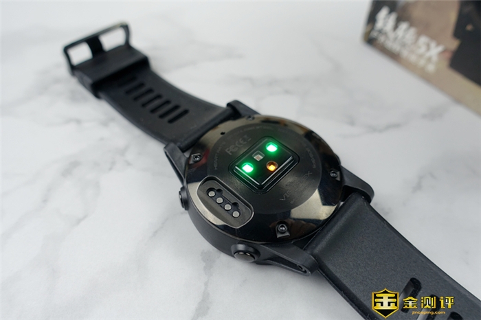 军拓5X运动智能手表的背面和整体的材质为一体,非常的坚实和耐用,内部集成了军拓自研的JTOUR OS手表系统,背面主要集成了VALENCELL光电心率监测器和充电触点接口。