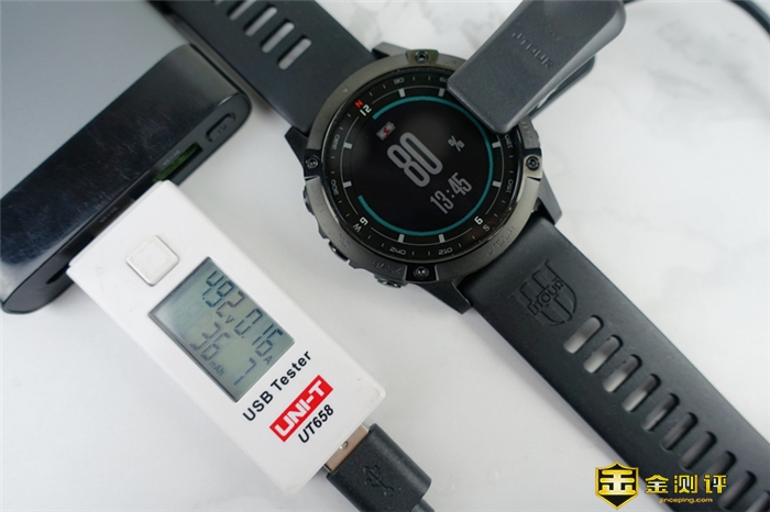 充电方式上还是延用了夹式触点充电方式,这种充电有个问题就是夹子必须夹住手表背面的触点才能正常充电,如果没有夹准那么就充不了电(笔者第一次充电,夹了好久才对准,不知为何),在充电上确实比较的快,通过下方的电流电压监测器可以看到,当前的电压为4.92V,电流为0.16A,从上面的数据可以看到,手表本身也带有充电保护装置,所以充电过程中功率比较的低,这也是保证手表在充电时的安全。