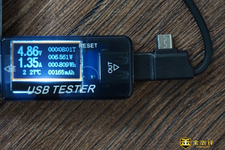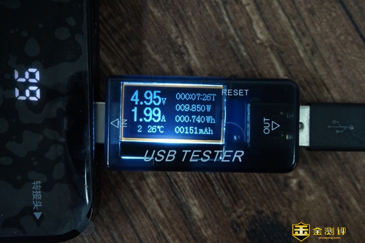 首先对 NINEKA/南卡POW-1无线充电宝的有线的输入输出进行测试,通过计量表测试充电宝的输入电压为4.86V,电流为1.35A,输出电压为4.95V,电流为1.99A,说明充电宝的充电效率与普通的适配器基本一致,与厂家标注的5V2.1A相差不大。