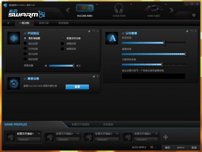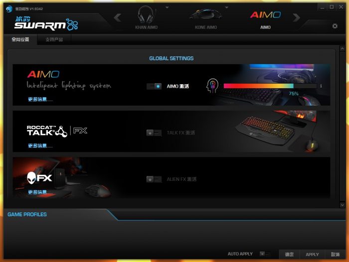 在“AIMO”页面,可以实现一键开启所有AIMO外设的AIMO智能化照明系统,这样就不需要分别进入鼠标、键盘、耳机页面做单独的开启操作了,一键激活,十分方便。另外,每个页面右下角都有“确认”和“APPLY”两个功能键,需要注意的是虽然它们都有“确定更改生效”的含义,但还是有些差别:“确认”按下后,SWARM会关闭并进入系统后台继续运行,“APPLY”并不会关闭SWARM页面。一开始我觉得这个设计挺令人费解的,现在想来估计是为了考虑那些骨灰级玩家在游戏中做极致操作而设计的吧。