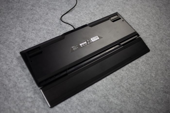 键盘底部到是没有什么太多可以聊的地方,设计比较简约。唯一值得说的就是那横穿整个键盘底面的防滑脚垫,这个设计跟人体工学手托是一致的,其抓地能力自然不言而喻。但是官宣上并没有说它支持防水,所以导水孔并没有见到,爱在电脑边吃饭喝水的用户需要多加注意。