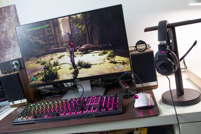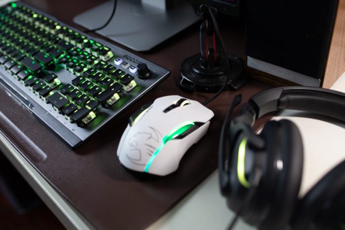 上机展示,除了白色Kone Aimo鼠标颜色略显违和,ROCCAT Vulcan 120 AIMO与Khan AIMO RGB耳机更搭,个人觉得鼠标如果是黑色的就更完美了哈!不过,这点仅存的违和感完全可以通过AIMO智能化照明系统消除掉噢!讲真,这套外设并不适合所有玩家,毕竟是价格太贵了,三件总价2400元左右。可能很多玩家会根据单个产品的优缺点然后东拼西凑出一套外设装备来。这里顺便讲一讲鼠标和耳机方面的优缺点吧,键盘的话会在本文其他地方做详细描述。