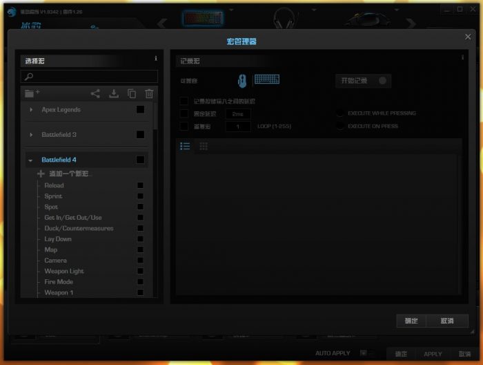 驱动中已经预装了41个宏,其中包含了许多主流游戏的宏预设,比如APEX、战地5等。