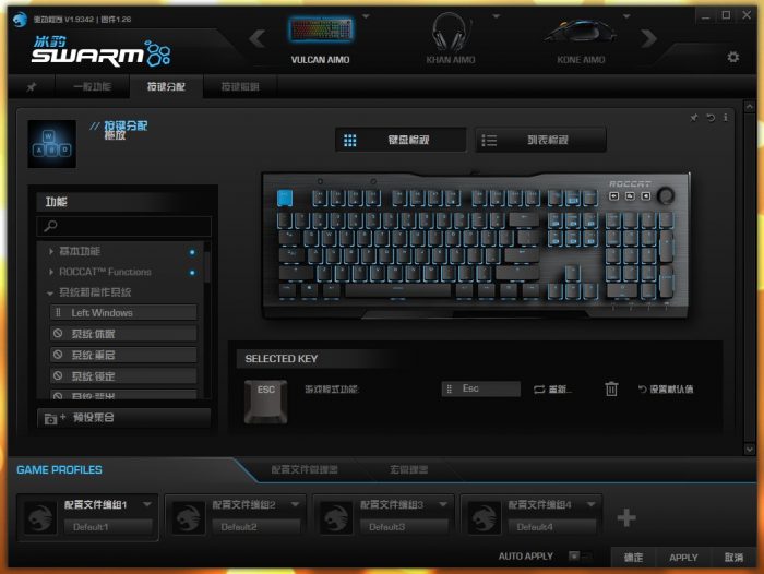 通过驱动可以看到ROCCAT Vulcan 120 AIMO支持全键自定义(静音键和Fn除外),拖拖放放的设定方式也显得十分方便。其中Fx键的自定义功能相比其他按键比较单一,试了一圈只有DPI加减才能映射到这个键位,但我发现把他自定义为DPI加减并不奏效,依然是默认的灯光亮度调节?