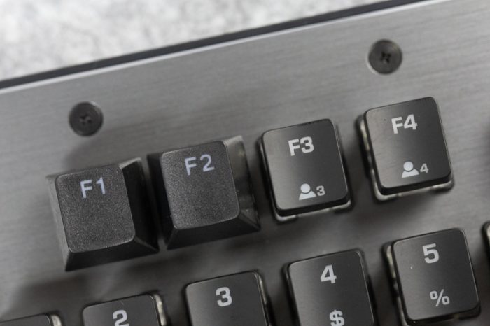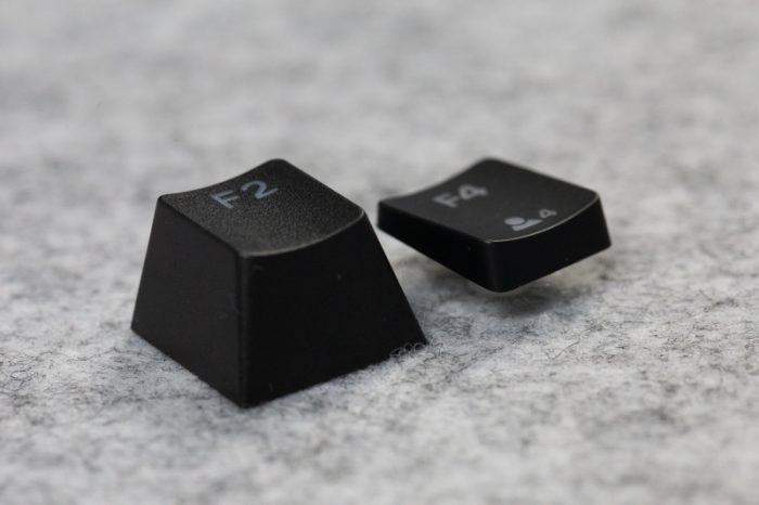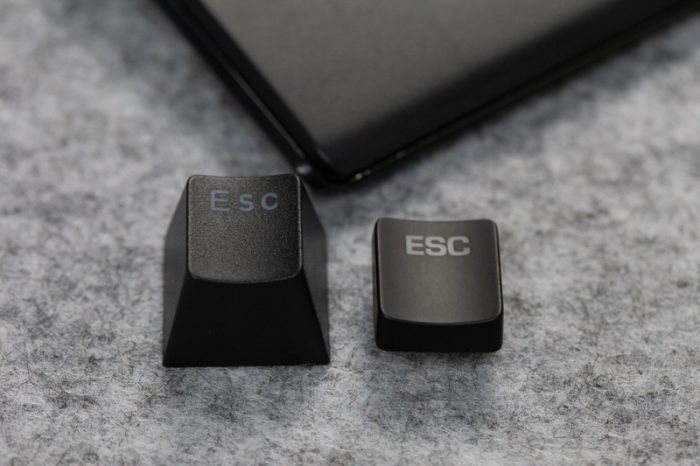 这款键盘的键帽看起来似乎间距过大?如下图所示,我把F1和F2换上了普通键帽,来跟原厂超薄键帽做了个对比,发现键帽间距并没什么差别,其实产生间距过大的原因在于原厂超薄键帽四壁大量削减,导致出来的一种错觉罢了,所以手指触摸键帽的定位感上并不会对用户造成困扰。