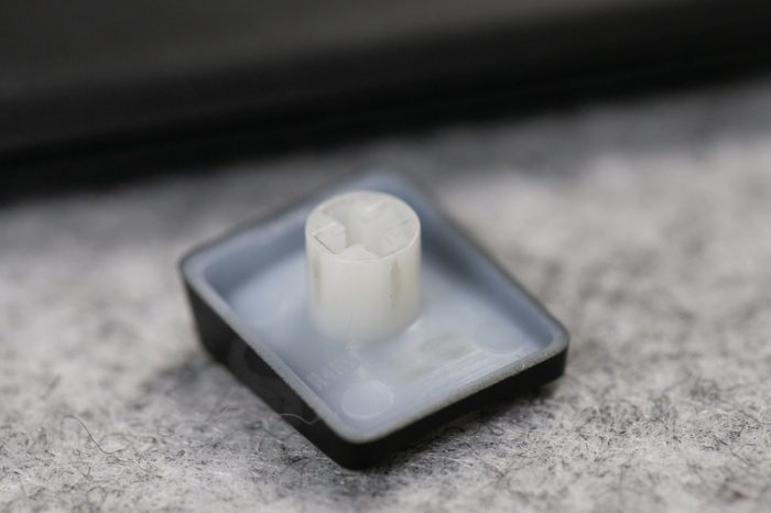 刚说到原厂键帽,可能大家对于这种超薄键帽产生一些疑虑,这么薄的键帽会带来好手感吗?下图是普通键帽与原厂键帽之间的对比,可以看到其实键帽手指触碰的界面大小跟普通键帽并没有什么区别,只是原厂键帽的四壁做了大幅度削减。