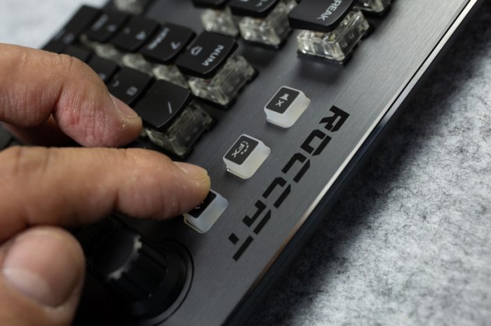 方向键的上方有6颗宏定义按键,配合Fn可以实现快速调用宏的功能。ROCCAT Vulcan 120 AIMO把状态指示灯(单色白光)放在了数字小键盘的下方,设计比较新颖,但如果使用数字小键盘的时候手腕会遮挡掉状态指示灯,可能会造成一些使用上的不便。