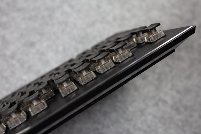 从侧面看,这款键盘的键帽高度几乎是一致的,并没有采用我们常见到的阶梯式人体工学设计,所以用户上手的时候还是需要花一点时间。不过好在键帽都做了下凹的处理,手指接触键帽的体验还是非常不错的。