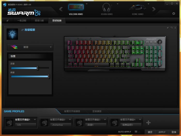 相信冰豹用户一定对于SWARM相当熟悉了,作为冰豹外设的“灵魂”,许多功能需要依赖它才能得以实现。键盘支持4组自定义配置文件,可通过Fn+F1-F4来实现快速切换,并且能够做到每组配置拥有自己的按键声音特效、按键分配和灯光特效。另外键盘内置了板载512kb存储,只要事先预设好配置,把键盘插到另一台装有SWARM的电脑上依然能生效,免去了重新设置的麻烦。