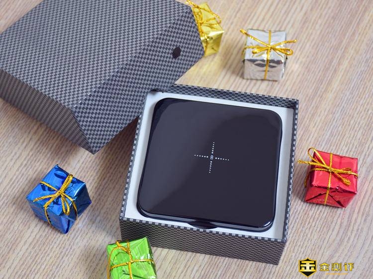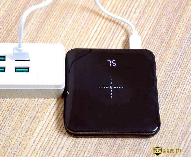南卡无线移动电源POW-1的尺寸很小巧,仅为87*87*18mm,整机重仅180g,作为10000mAh的移动电源,比其他品牌的同容量产品体积要小很多,携带起来更方便。南卡无线移动电源POW-1正面采用镜面设计,颜值不错。它采用数字式电量显示,在正面上部设计有白色LED数码管电量显示。在中心位置有一个电池充电的标志,四周延伸出一个“十”字型,这里是无线充电区域。