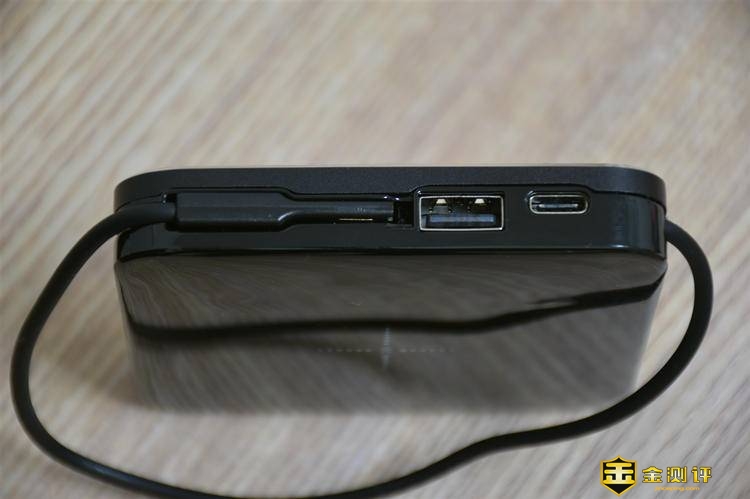 除此之外,南卡无线移动电源POW-1机身侧面还有一个USB放电口和一个type-c充电口,可以和随机附带的白色USB转Type-C线缆充放电。