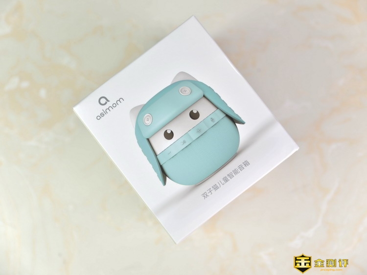 阿希莫双子猫儿童智能音箱的包装盒颇为小巧,包装盒正面右上角是阿希莫的品牌Logo,中间印有产品的实物图,值得一提的是阿希莫双子猫儿童智能音箱有粉色和蓝色两款,这两款不仅颜色不同,外观造型也是有差异的。
