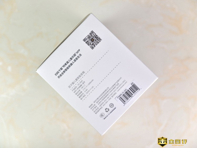 包装盒的背面印有产品的相关规格参数,在这里还有阿希莫儿童乐园APP的二维码,但是笔者继续体验下去才发现这个APP是不存在的,因为阿希莫双子猫儿童智能音箱是通过微信公众号来管理控制的。