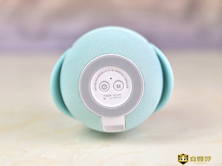 阿希莫双子猫儿童智能音箱的底部外圈贴有一整圈的防滑胶垫,用来保证阿希莫双子猫儿童智能音箱摆放后的稳定性。这里还印有阿希莫双子猫儿童智能音箱相关的信息,并且在中间还设置了开关按键、模式切换按键和恢复出厂设置的插孔。其中模式按键是用来切换阿希莫双子猫儿童智能音箱的WIFI连接模式和蓝牙连接模式的。