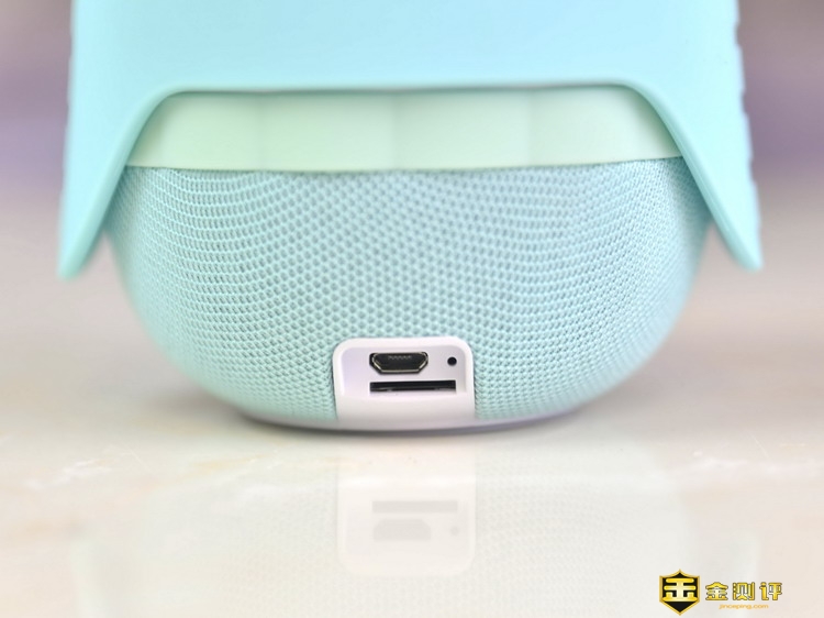 在机身背面的下方,设计有Micro USB充电口,充电口的右侧还有个指示灯。充电口的下方则是TF卡槽,如果手上有想播放的儿歌,语音故事之类的,都可以存放到TF卡里,然后插到卡槽里,直接通过阿希莫双子猫儿童智能音箱播放。
