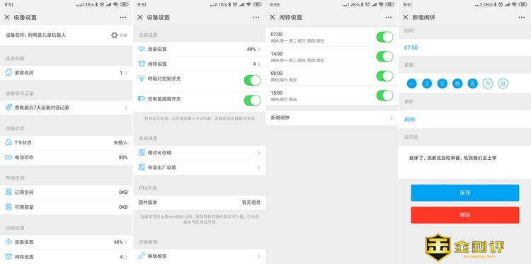 阿希莫双子猫儿童智能音箱在公众号的设备设置里添加家庭成员,并且可以看到与阿希莫双子猫儿童智能音箱人机交互的聊天记录。这里还可以看到设备的电量,管理插入的TF卡,调节音量,设置闹钟,控制呼吸灯开关,打开低电量提醒。闹钟的设置比较有趣,还可以设置在闹钟响的时候同步响起预设的文字语音。