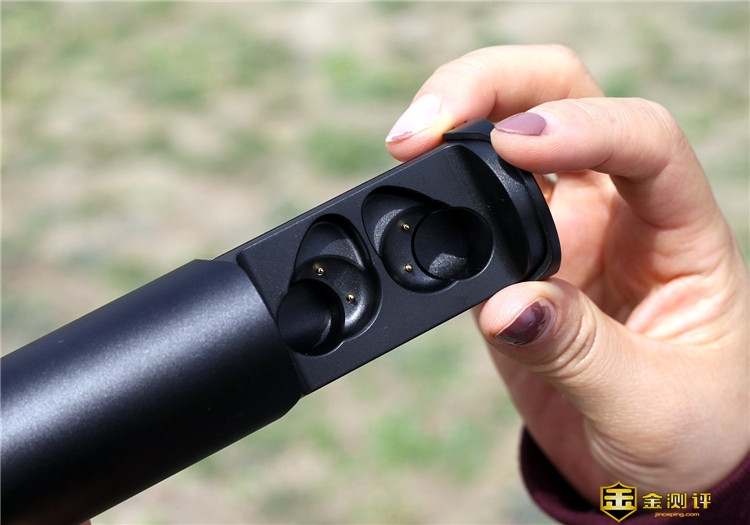 充电舱采用抽屉式设计,捏住两边轻轻一拉就可以打开。可以看到里面有两个耳机的仓位,同样,他也是采用了磁吸式设计。只需要把耳机轻轻的放入,就能够牢牢的吸附在里面。两个充电触点可以很好的与耳机接触,并进行充电。
