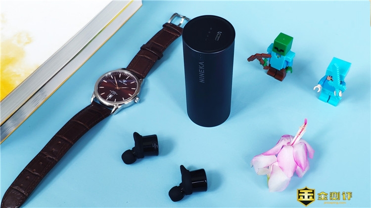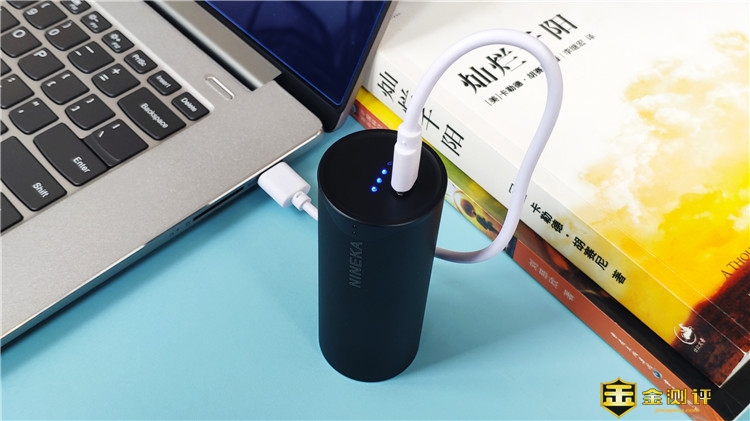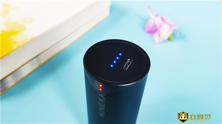 充电仓圆柱形设计,高度约9CM,直径约3.8CM,大小适中携带很方便。圆柱形表面是铝合金材质,其保证整体轻便的同时,极大的提升了抗摔能力,而且表面有轻微磨砂感,能减轻指纹残留;此外两侧平面都采用内凹设计,可以很稳定的立住,并避免产生划痕。