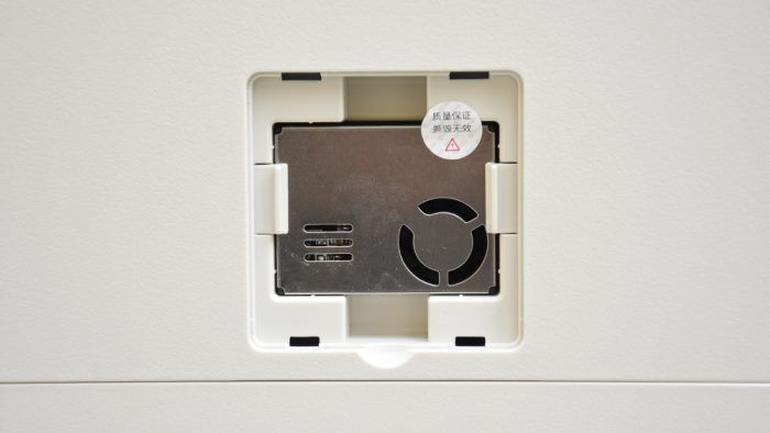 下方一整块是可拆卸的滤芯仓盖板,采用卡扣式的设计,打开以后可以看到机身内部的滤芯。X60的结构设计并不复杂,与传统侧进风上出风的空净产品基本一致。滤芯仓边缘的位置设计有一个滤芯复位开关,向外拉出可以释放滤芯。