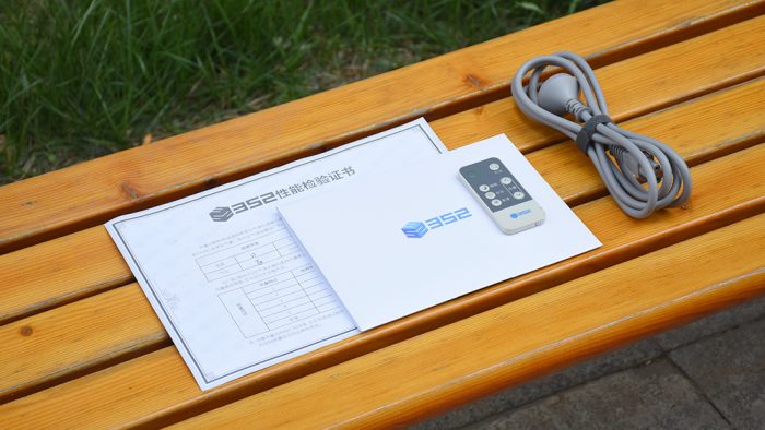 随机附件包含一条电源线、一个红外线遥控器、一份使用手册和三包凭证以及352官方出具的性能检验证书,属于中规中矩的附件配备情况。