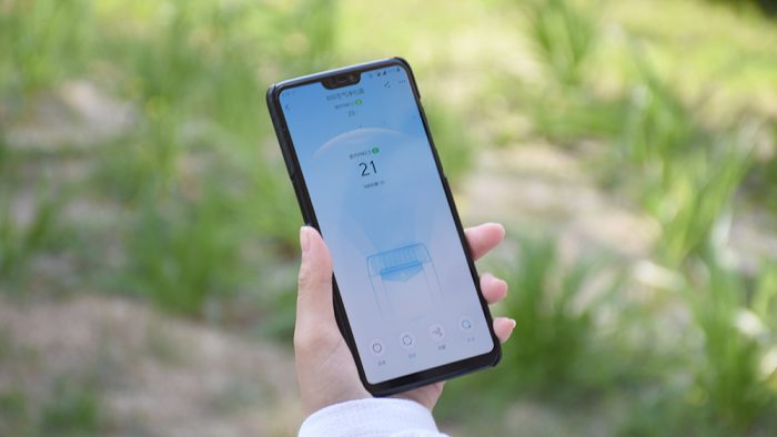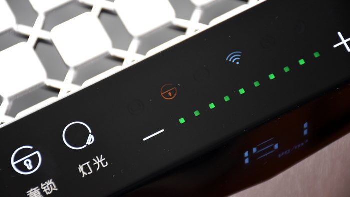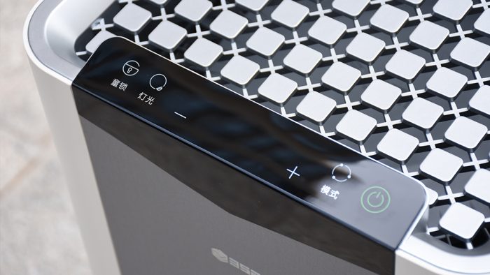 在机身顶部和正面衔接处有一个梯形的操作区域,这正是X60的操作面板,采用全触控屏幕。将触控面板调整为带有坡度的设计,会更加方便用户使用,符合人体工程学。触控面板包含一块显示屏和常用的功能按键以及风量调节按键。