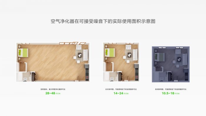 业界一直以CADR值作为评价一款空气净化器能力的重要指标,而事实上这样的认知是片面的。在某友商空净产品发布会上,罗胖胖提出了“最大CADR值并不能代表空气净化器的实际净化能力,空气净化器在工作时由于风机转动会产生噪音,所以在最大CADR值工作状态下,用户几乎是无法正常待在室内”的论调,一度也是引起了行业和用户的关注。事实上,在用户可以接受的噪音环境下,空气净化器的实际净化能力是要打折扣的。以国标计算公式面积=CADR*(0.07~0.12)来进行计算,X60的使用面积最大约为63平方米。