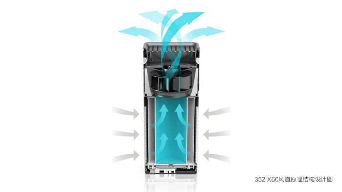 实际的净化能力是衡量一款空气净化器的重要指标,也是所有空净产品不得不面对的严苛测试。在设计原理上,X60采用了主流的侧进风上出风的风道结构,能够避免被净化过的空气排出后吹起地面的扬尘导致再次污染,这也是目前业内普遍认为最合理的风道结构设计,因而从百元价位到几千元价位的空气净化器都采用类似的结构设计。